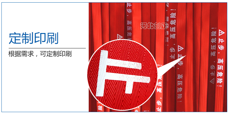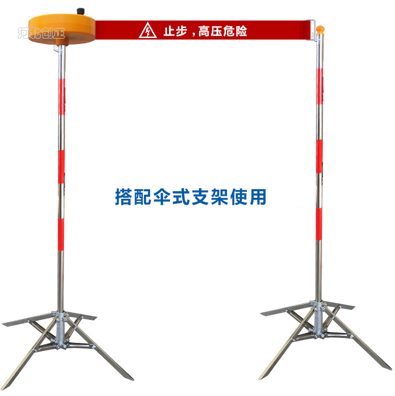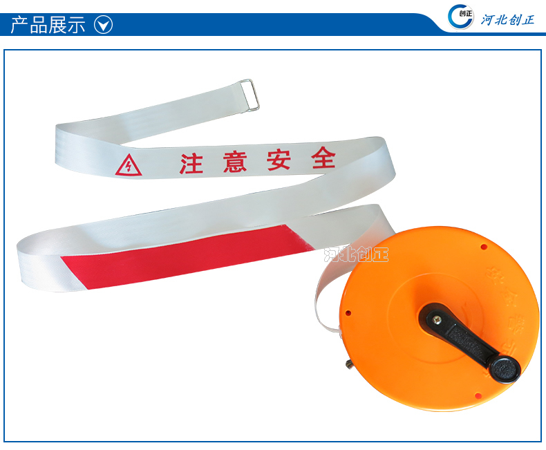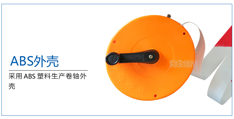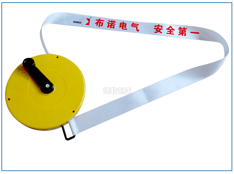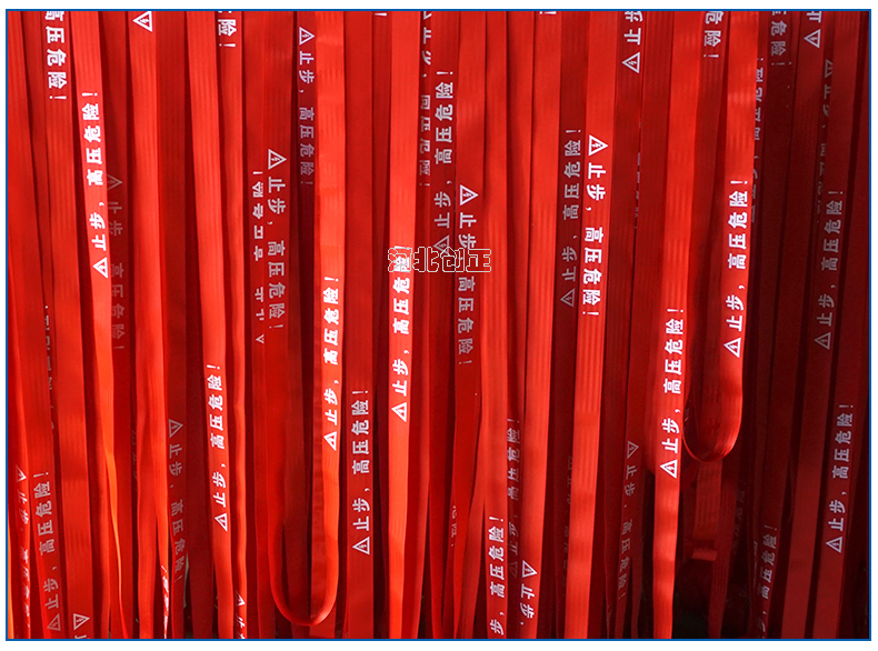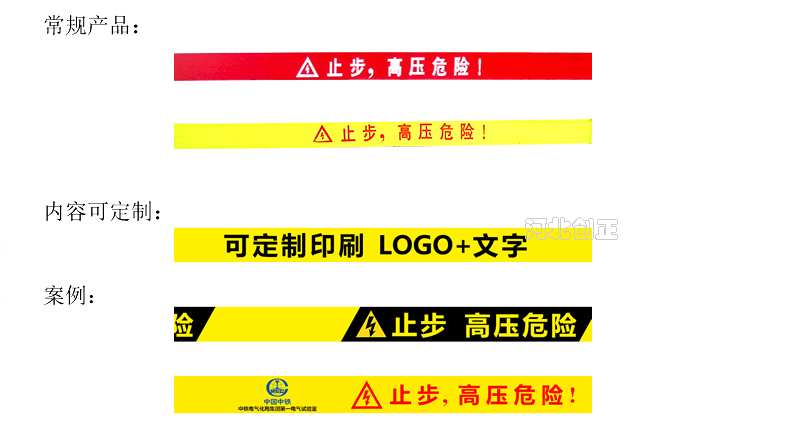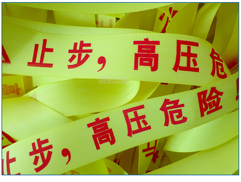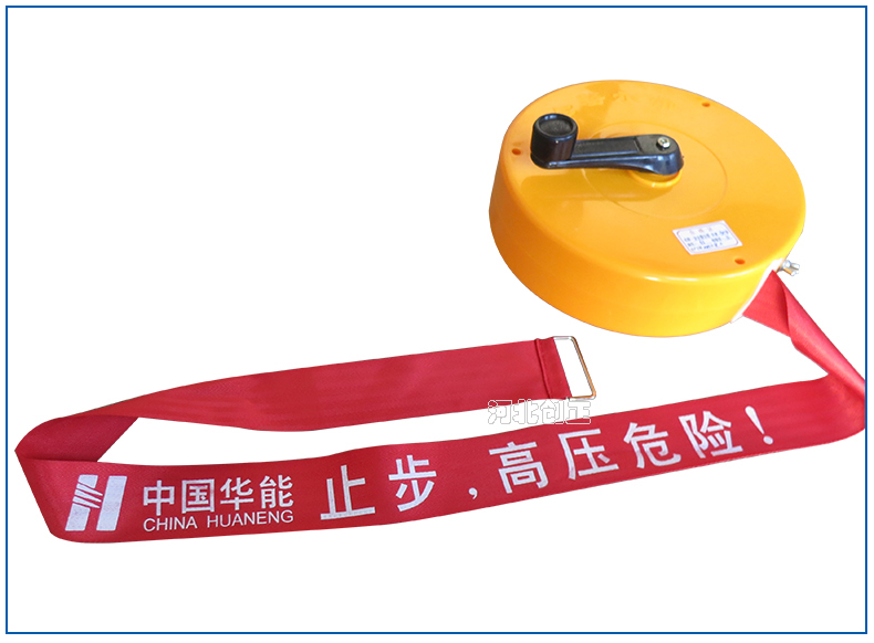 警示帶盒是ABS材料制成;帶是錦綸材質(zhì),上面印有“閃電符號,止步,高壓危險”等字樣。