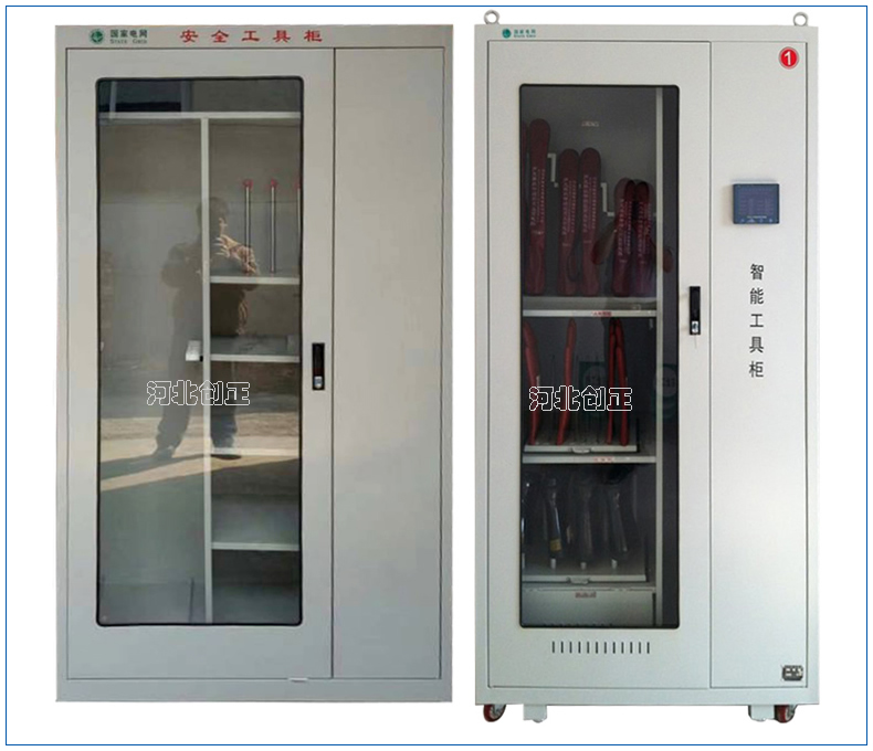 1、柜體是冷軋鋼板卷壓成型,厚度有1.0mm,1.2mm,1.5mm供選擇。柜體表面采用靜電防腐噴塑工藝,顏色為駝灰色,柜門裝有通體透明鋼化玻璃,透過玻璃可以看到分類有序的工器具。