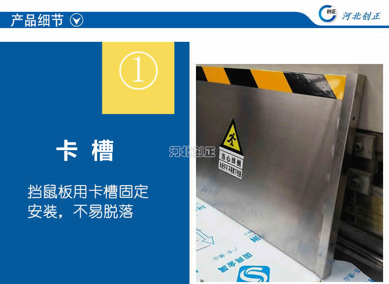 不銹鋼擋鼠板表面經防腐處理。擋板上部貼有黃黑相間的反光條,起到警示作用。
